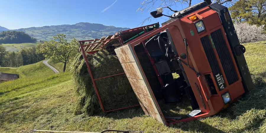 Am Donnerstagnachmittag verunfallte ein 42-jähriger Landwirt mit einem Heulader an der Sonnenbergstrasse in Seewen. Das Fahrzeug kippte kurz vor 17 Uhr im unebenen Gelände auf die Seite.
