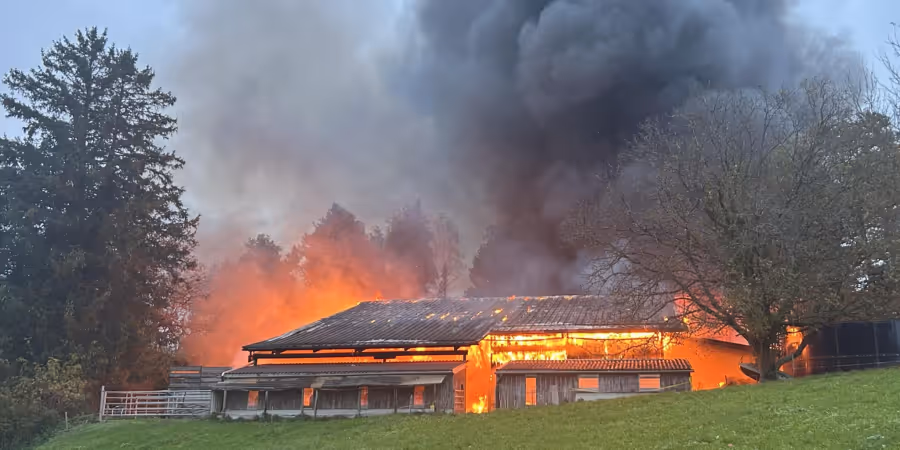 Beim Eintreffen der sofort ausgerückten Einsatzkräfte stand der Stall in Vollbrand. Wegen des Brandes lief eine grössere Menge Diesel aus einem Tank. Der Landwirt erlitt leichte Verletzungen und wurde durch einen Rettungsdienst medizinisch versorgt.