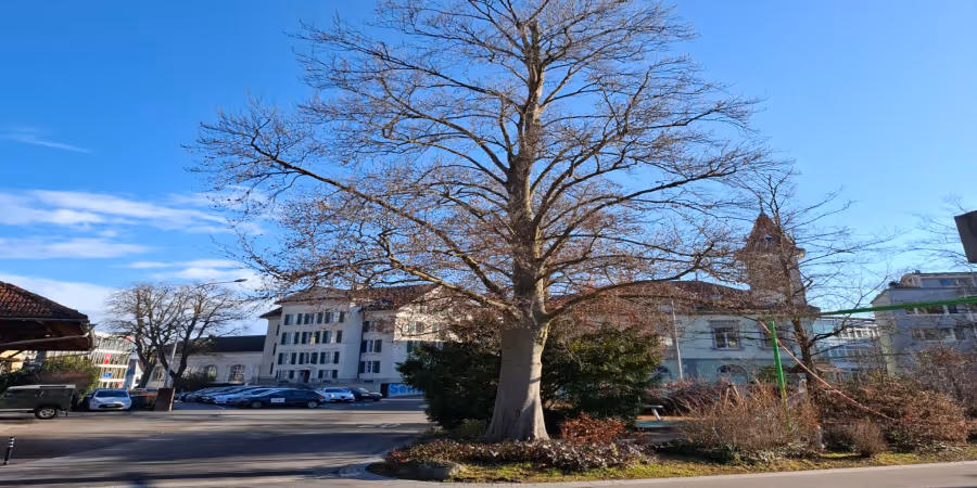 Wegen Befalls mit Brandkrustenpilz wird die Rotbuche auf dem Rigiplatz in Cham aus Sicherheitsgründen im Februar 2026 gefällt. Eine Ersatzpflanzung ist geplant.