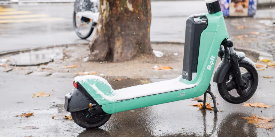 Ein parkiertes und mit Schnee bedecktes E-Trottinett. - Stadt Zürich
