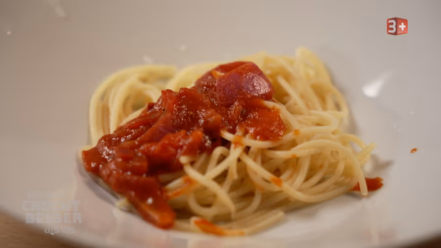 Und während sie versucht, irgendwie eine Sauce zu erstellen, hört man von ihrer Mutter Anekdoten aus der Jugendzeit: «Wenn ich früher Spaghetti gemacht habe, habe ich immer gesagt, zieht euch den roten Plüschpullover an!»