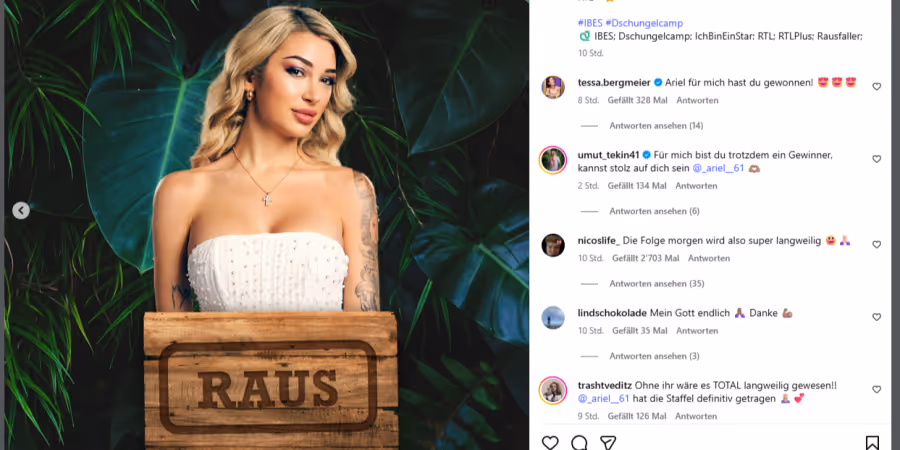 Bei den Zuschauern sorgt Ariels Rauswurf für heftige Reaktionen. Auf Instagram überschlagen sich die Kommentare: «WOW da hätte ich niemals mit gerechnet.» Und: «Die Folge morgen wird also super langweilig.»