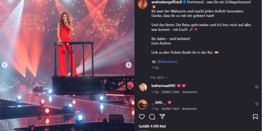 Neben der Kritik bleibt Andrea Berg eine der wichtigsten Figuren im deutschen Schlager. Sie kündigte zudem ihre grosse Tournee 2027 mit 24 Konzerten in Deutschland, Österreich und der Schweiz an.