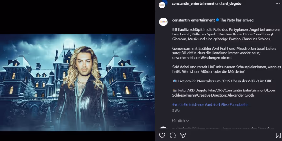 Bill Kaulitz übernahm am 22. November 2025 in «Tödliches Spiel – Das Live-Krimi-Dinner» die schillernde Rolle des Partyplaners Angel. Der Musiker brachte Glamour, Witz und eine Portion Chaos in das improvisierte TV-Event, das live ausgestrahlt wurde.