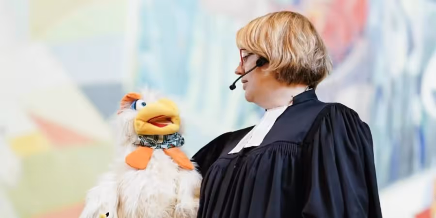 Der Hahn mit dem grossen gelben Schnabel bringe den Blickwinkel des Nichttheologen ein. Dabei stelle der Hahn Otto nicht nur Fragen, sondern habe auch etwas zu sagen, erklärte Gustrau. Ihr gehe es um ein neues Format und mehr Witz in der Kirche. Thema des Zwiegesprächs war: «Ich muss heut mal politisch sein, sagt Otto».