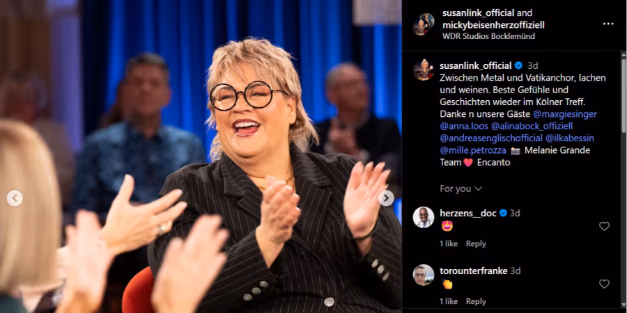 Den «Kölner Treff» besuchten auch weitere Gäste wie Mille Petrozza und Max Giesinger, moderiert von Susan Link und Micky Beisenherz. Ilka Bessin bleibt auch abseits der Figur Cindy aus Marzahn sehr gefragt, so das Portal «News.de».