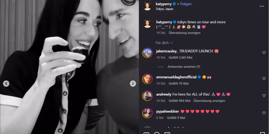 Katy Perry hat am Samstag erste gemeinsame Fotos mit Justin Trudeau auf Instagram geteilt. Die Aufnahmen zeigen das Paar in Japan während ihrer Tour, wie der «Stern» berichtet.