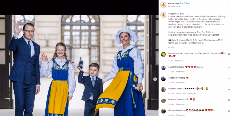Prinz Carl Philip (43) nahm an der Wachablösung im Hof des Stockholmer Schlosses teil. Am Abend fährt die königliche Familie mit einer Pferdekutsche durch Stockholm zum Freilichtmuseum Skansen. Dort wird der König verschiedene Vereine auszeichnen. Danach findet ein Empfang im Schloss statt, zu dem unter anderem Vertreter der Regierung und des Reichstags eingeladen sind.