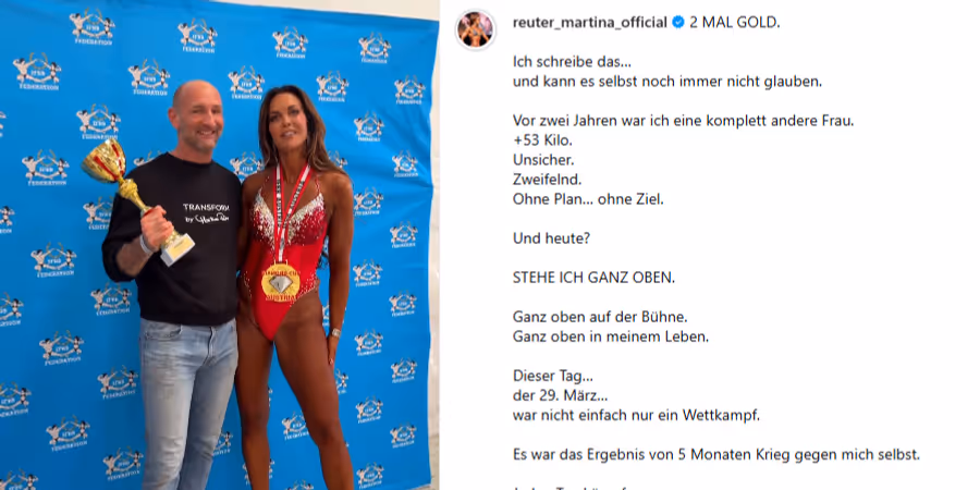 Martina Reuter (46) gewann beim IFBB Diamond Cup in Klagenfurt zweimal Gold in der Kategorie «Fit Model». Sie belegte sowohl beim Diamond Cup als auch beim Beginner Cup jeweils den ersten Platz, wie «Focus» berichtet.