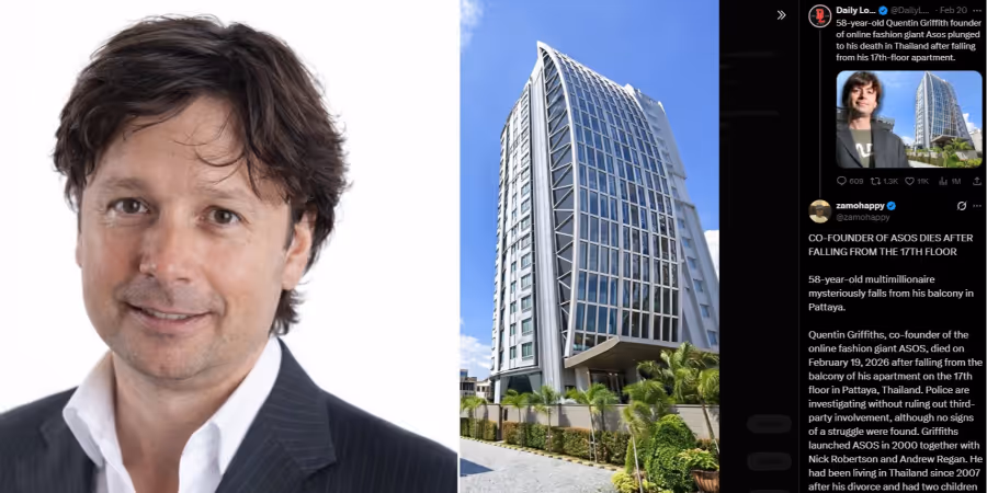 - Der Asos-Mitgründer Quentin Griffiths stürzte am 9. Februar aus einem Hochhaus in Pattaya.