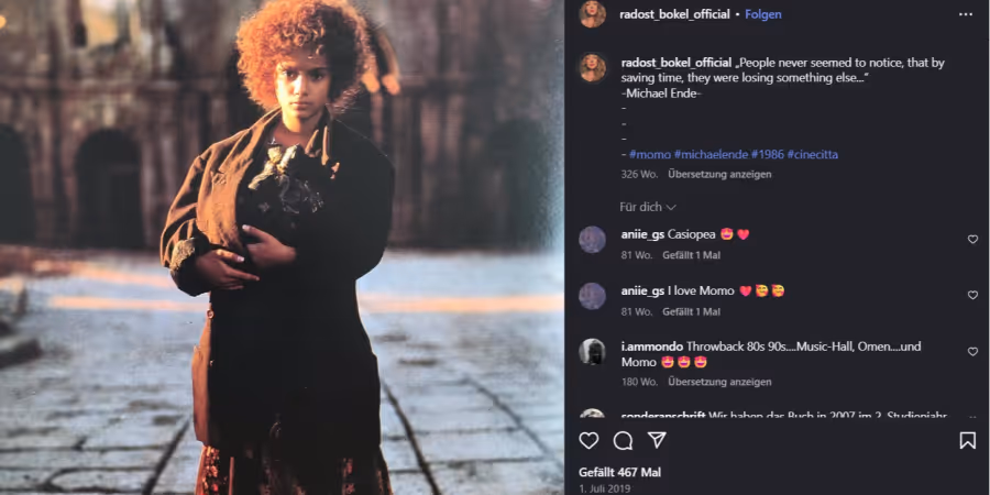 Vor fast 40 Jahren verzauberte Radost Bokel als kleines Mädchen mit der Rolle der «Momo» die Zuschauer. Die 1986 entstandene Verfilmung des Michael-Ende-Klassikers wurde damals ein grosser Erfolg mit über 2,1 Millionen Kinobesuchern, berichtet die «Bild».