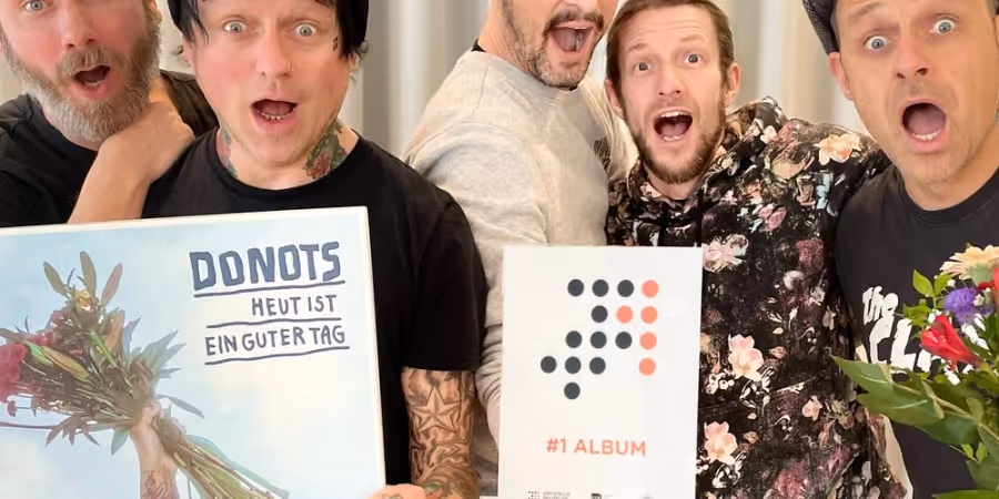Nach fast 30 Jahren haben es die Donots geschafft: Die NRW-Punkband hat es mit ihrem neuen Album «Heut ist ein guter Tag» zum ersten Mal an die Chartspitze geschafft. Nachdem das Quintett in seiner langen Karriere bereits fünf Top-10-Platten hingelegt hat, besteigt es im 29. Jahr seines Bestehens nun erstmals den Thron der Offiziellen Deutschen Album-Charts, ermittelt von GfK Entertainment.