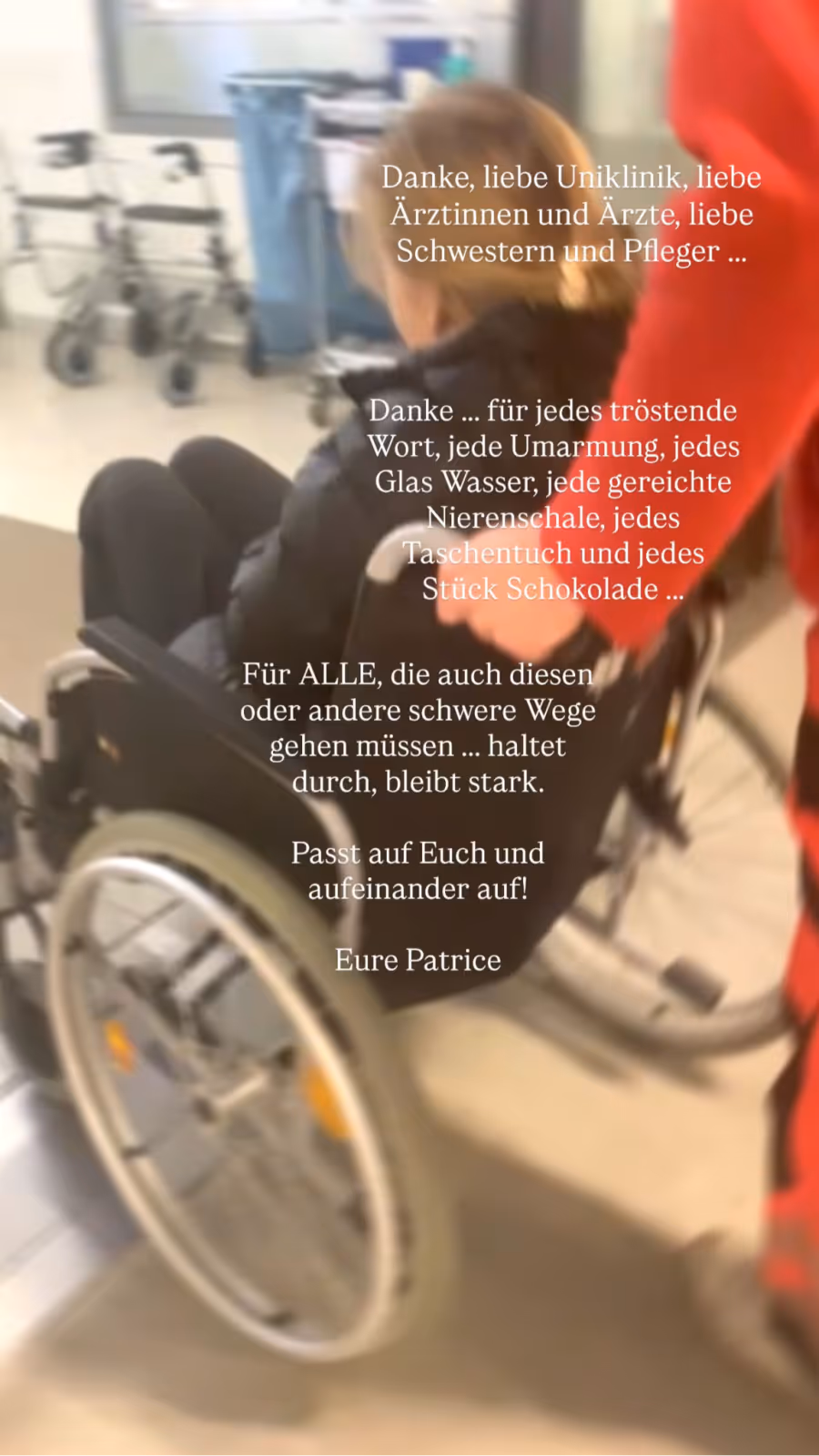 Sie teilt zudem ein Foto, das sie im Rollstuhl zeigt. Darunter bedankt sich die 30-Jährige beim Klinikpersonal: «Danke für jedes tröstende Wort, jede Umarmung, jedes Glas Wasser, jede gereichte Nierenschale, jedes Stück Schokolade.»