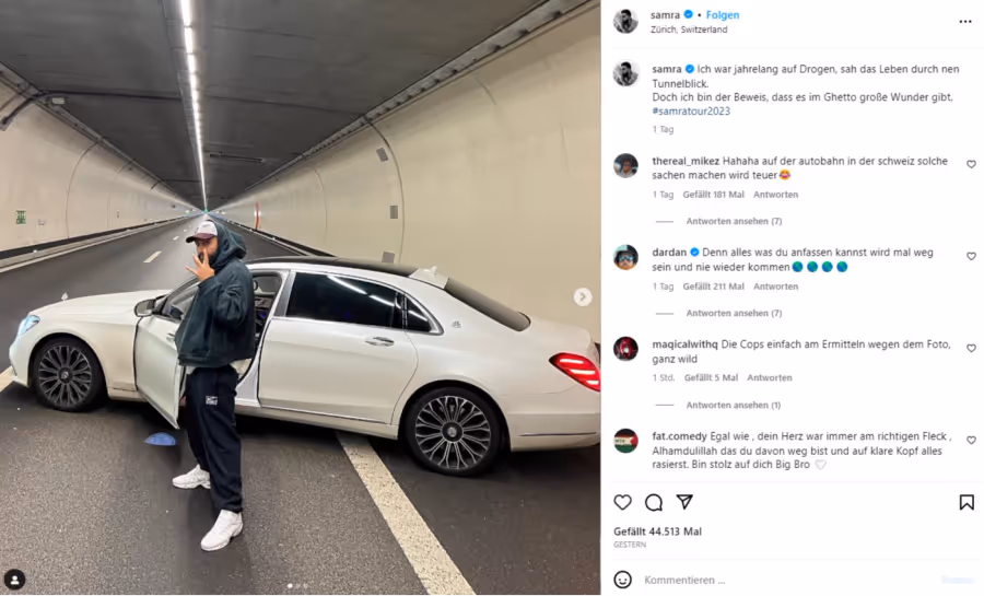 Der bekannte Rapper Samra, 30 Jahre alt, geriet mit einem Instagram-Post aus dem Uetlibergtunnel in Zürich in die Kritik. Er hatte dort 2023 sein Fahrzeug quer über die rechte Fahrspur abgestellt und sich davor fotografiert.