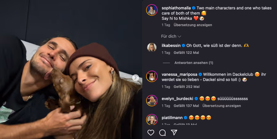 Sophia Thomalla und Alexander Zverev haben ein neues Familienmitglied. Der Dackelwelpe Mishka sorgt für Begeisterung bei Fans und Prominenten.