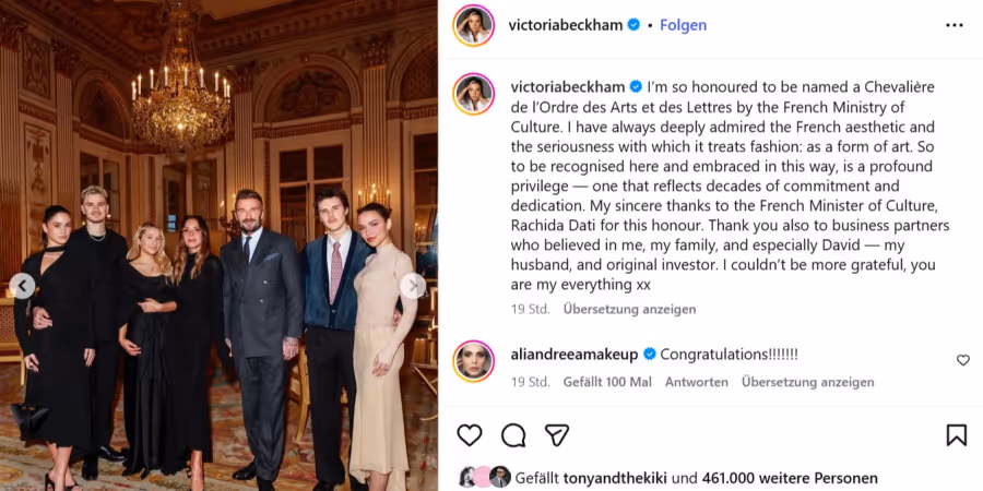 David Beckham postete ebenfalls und betonte den Familienstolz überschwänglich: «Wir sind so stolz auf dich und all deine Erfolge», schrieb er auf Instagram.