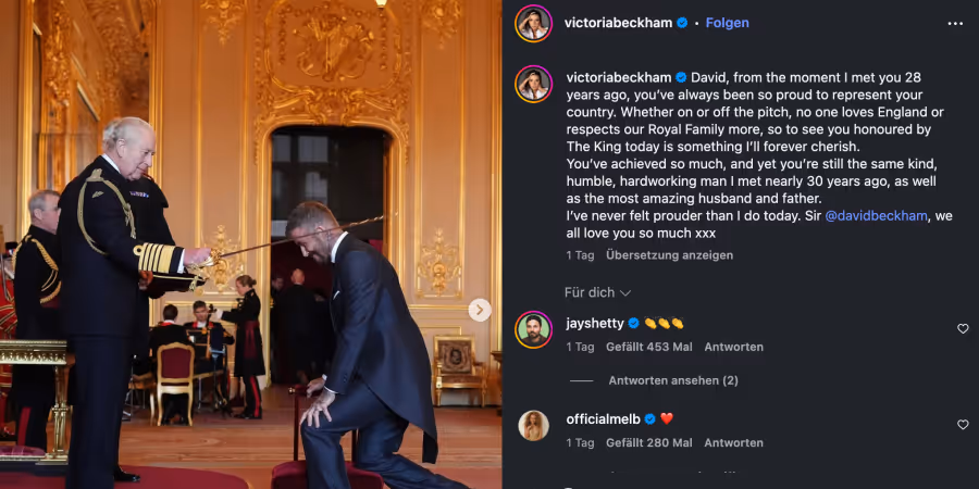 Zudem ist er seit Jahren UNICEF-Botschafter sowie Unterstützer von König Charles’ Stiftung, wie «People» berichtet. Nun wird er offiziell Sir David Beckham genannt, während Victoria den Titel Lady Beckham führt.