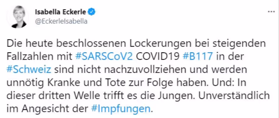 Die beschlossenen Lockerungen «bei steigenden Fallzahlen» seien «nicht nachzuvollziehen» und würden «unnötig Kranke und Tote» zur Folge haben, enervierte sich Eckerle via Twitter. Ein paar Tage später räumte die Professorin an der Universität Genf offen ein: «Ich bin einfach nur noch wütend.»