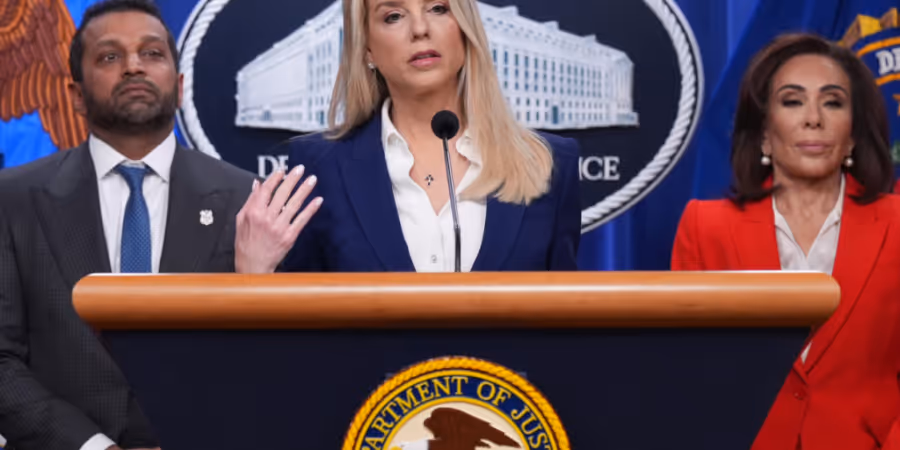 US-Generalstaatsanwältin Pam Bondi (M) FBI-Direktor Kash Patel (l)und Jeanine Pirro, US-Staatsanwältin für den District of Columbia, sprechen vor Reportern im Justizministerium, um d... - Keystone/AP/J. Scott Applewhite