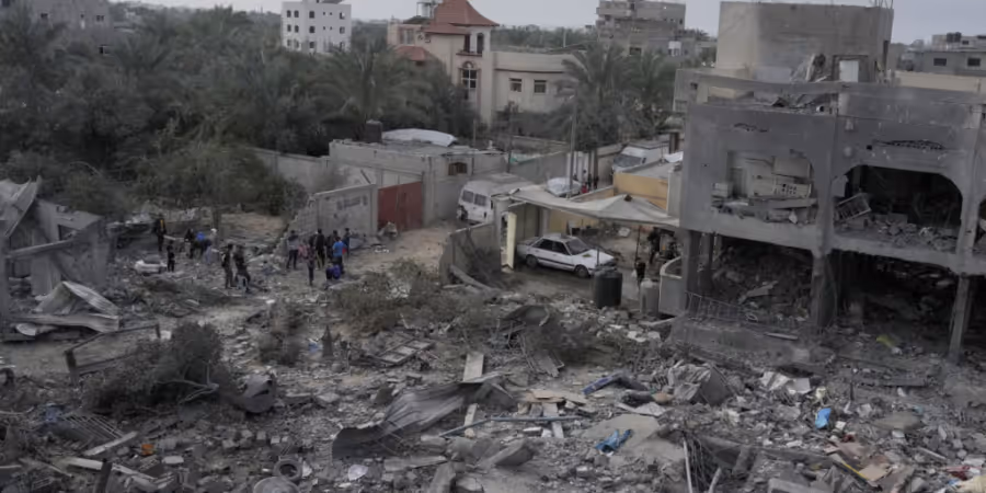 ARCHIV - Palästinenser betrachten die Trümmer eines Gebäudes, das bei einer israelischen Bombardierung zerstört wurde. Foto: Hatem Moussa/AP/dpa - Keystone/AP/Hatem Moussa