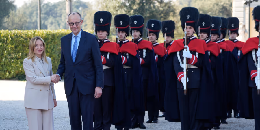 Das Treffen findet in der Villa Pamphilj statt, wo Italien wichtige Staatsgäste empfängt. Vor den Regierungskonsultationen trafen sich Merz und Meloni unter vier Augen im «Vestibolo degli amori difficili», dem «Vestibül der schwierigen Lieben». Das Verhältnis zwischen dem CDU-Kanzler und der Regierungschefin von der Rechtspartei Fratelli d'Italia (Brüder Italiens) ist jedoch alles andere als belastet. Im Gegenteil: Die beiden haben ihre Zusammenarbeit im ersten Dreivierteljahr immer weiter ausgebaut.