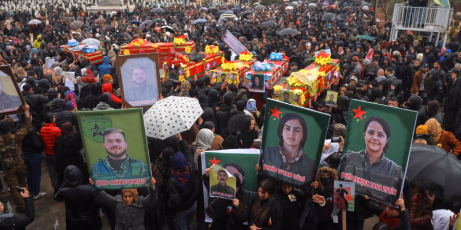 Trauernde nehmen an der Beerdigung von Kämpfern der kurdisch geführten Syrischen Demokratischen Kräfte (SDF) teil, die Anfang dieses Monats bei Zusammenstößen mit syrischen Regieru... - Keystone/AP/Baderkhan Ahmad