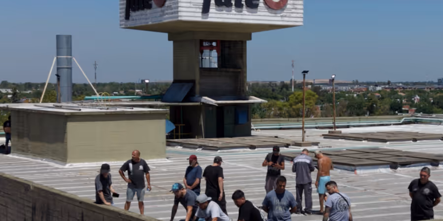 Arbeiter protestieren auf dem Dach, nachdem der argentinische Reifenhersteller Fate die Schließung seines Werks in Buenos Aires angekündigt hat. Foto: Rodrigo Abd/AP/dpa - Keystone/AP/Rodrigo Abd