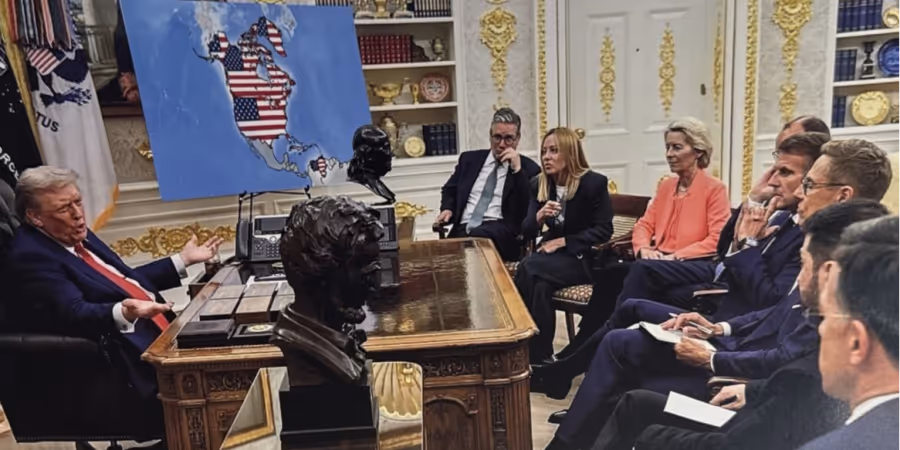 Bei dem Originalbild hatten sich unter anderem EU-Kommissionspräsidentin Ursula von der Leyen, der britische Premierminister Keir Starmer und die italienische Ministerpräsidentin Giorgia Meloni im August mit Trump im Oval Office getroffen und über Lösungen im Ukraine-Krieg gesprochen.