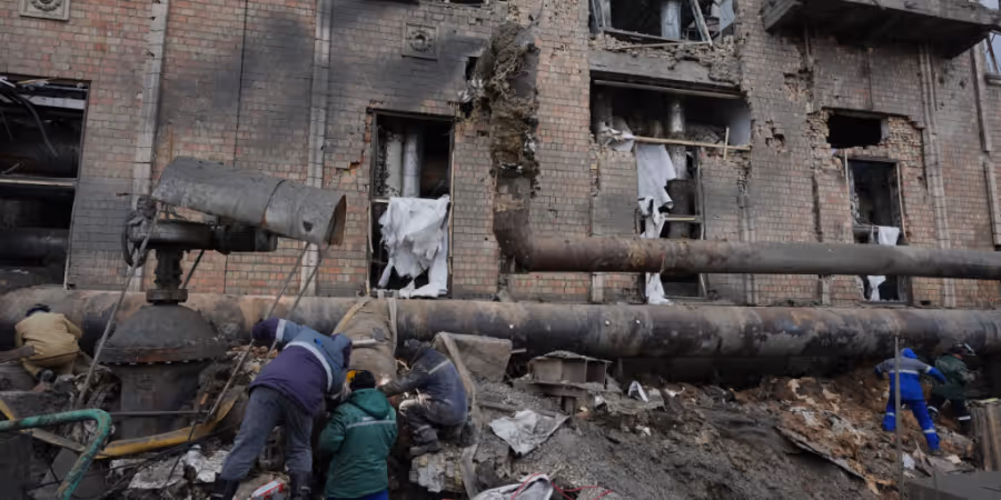 Arbeiter beseitigen Schäden im Wärmekraftwerk Darnyzja nach einem russischen Angriff in Kiew. Foto: Sergei Grits/AP/dpa - Keystone/AP/Sergei Grits