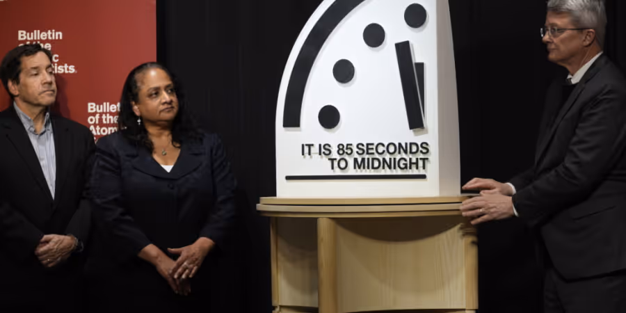 Angesichts der instabilen Weltlage haben Wissenschaftler die Zeiger der «Weltuntergangsuhr» erstmals auf 85 Sekunden vor Mitternacht gestellt und damit vor einer globalen Katastrophe gewarnt. Sorge bereiteten unter anderem aggressives Verhalten der Nuklearmächte Russland, China und USA, die Klimakrise, Konflikte in der Ukraine und im Nahen Osten sowie mögliche Auswirkungen von Künstlicher Intelligenz, teilten die Forscherinnen und Forscher des «Bulletin of the Atomic Scientists» in Washington mit.