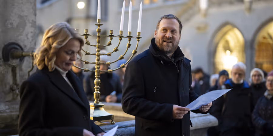 Etwa 100 Menschen haben sich am Dienstagabend auf dem Berner Rathausplatz zur Feier des jüdischen Lichterfests, Chanukka genannt, zusammengefunden. Der Anlass wurde vom Anschlag am Bondi Beach in Australien überschattet.