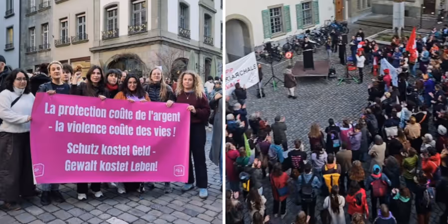 Rund 600 Personen haben am Dienstagabend vor dem Berner Rathaus gegen patriarchale Gewalt demonstriert. Sie forderten besseren Schutz und zusätzliche Mittel für Menschen, die von geschlechtsspezifischer und sexualisierter Gewalt betroffen sind.