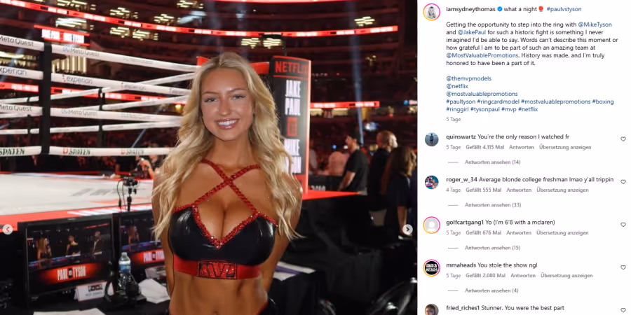 Beim Boxkampf zwischen Mike Tyson und Jake Paul stahl Sydney Thomas allen die Show. Zugegeben: Angesichts der fraglichen sportlichen Qualität des Show-Fights nicht allzu schwierig. Aber die 20-Jährige wurde als Ring-Girl über Nacht zum Internet-Star. Sie tauchte nicht nur in der Übertragung auf, sondern teilte auch fleissig Eindrücke auf Instagram.