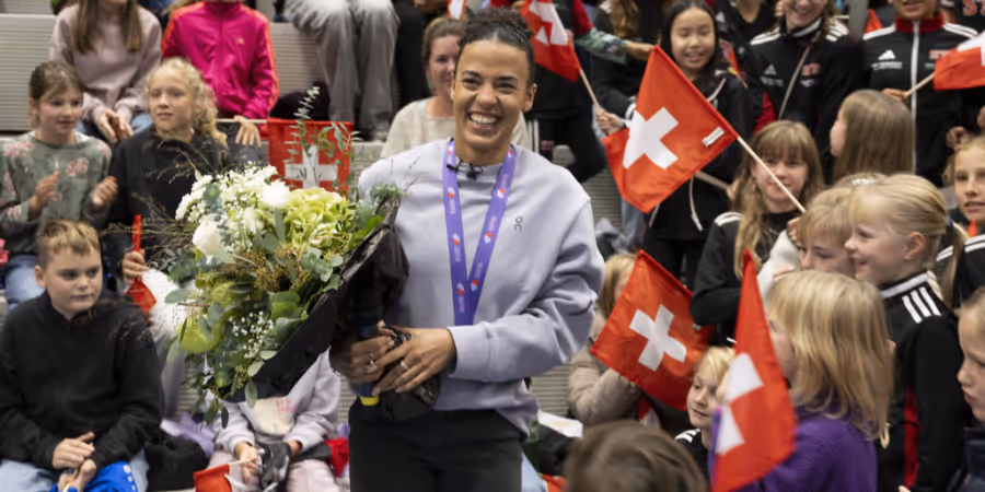 Weltmeisterin Ditaji Kambundji ist zurück in der Schweiz und wird in ihrer Heimat Köniz von Fans mit Applaus für ihre Leistungen empfangen.