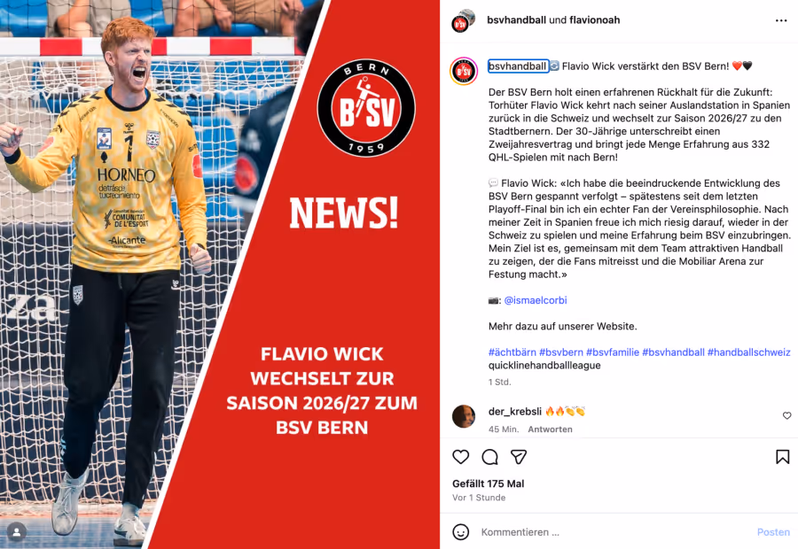 Wick sagt: «Nach meiner Zeit in Spanien freue ich mich riesig darauf, wieder in der Schweiz zu spielen.» Ebenso freue er sich darauf, seine Erfahrung beim BSV Bern einzubringen.