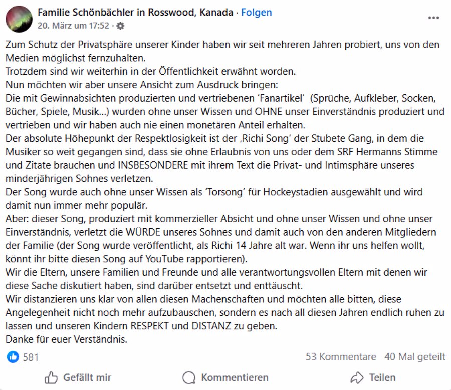 Der Satz «Richi! Ich ha gseit, du söusch di guet häbe» ist seit der TV-Doku zwar in der ganzen Schweiz bekannt. Dass er aber selbst in einem Lied verwendet wird, verletze die Würde ihres Sohnes, so die Schönbächlers.