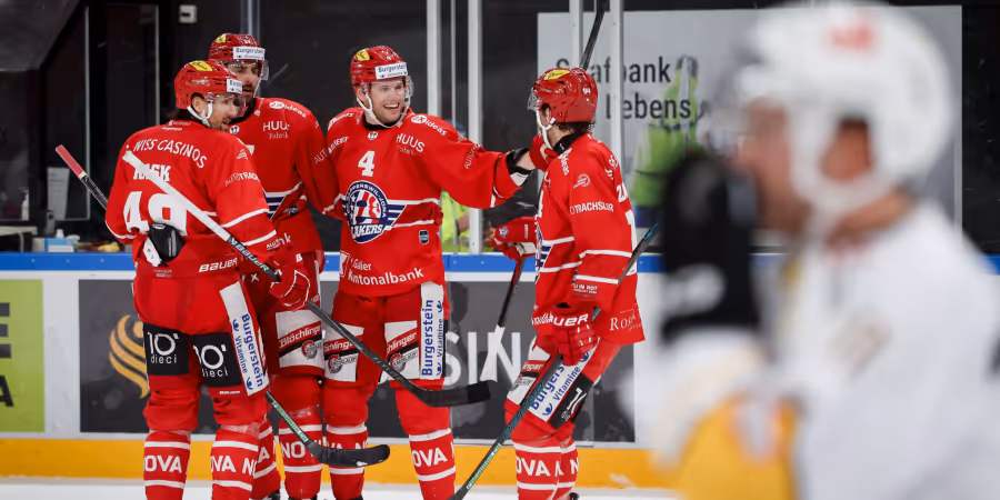 - Die Rapperswil-Jona Lakers feiern einen Penalty-Sieg gegen Lugano.