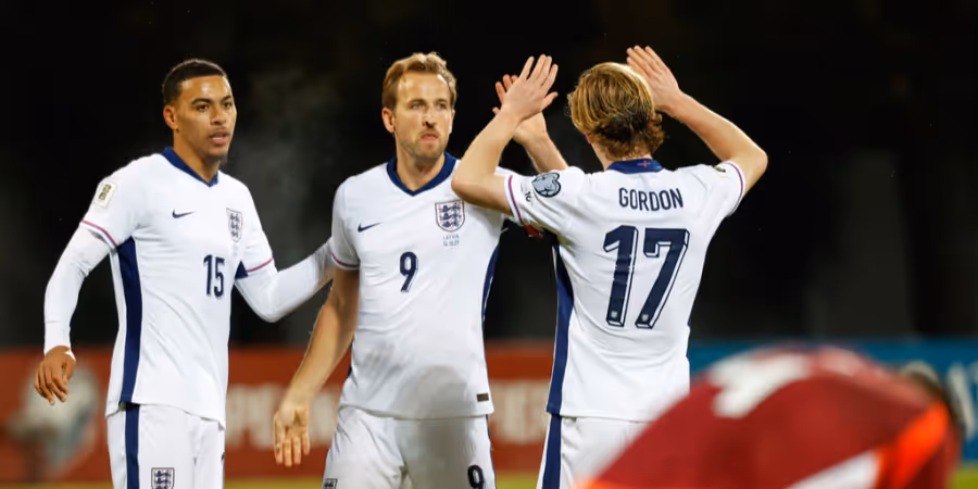 England sichert sich das WM-Ticket – und das souverän. Die «Three Lions» bezwingen Lettland auswärts mit 5:0 und können sich dabei auf ihren Captain verlassen. Stürmerstar Harry Kane trifft doppelt. Für die weiteren Treffer sorgen Gordon, Eze und ein Eigentor.