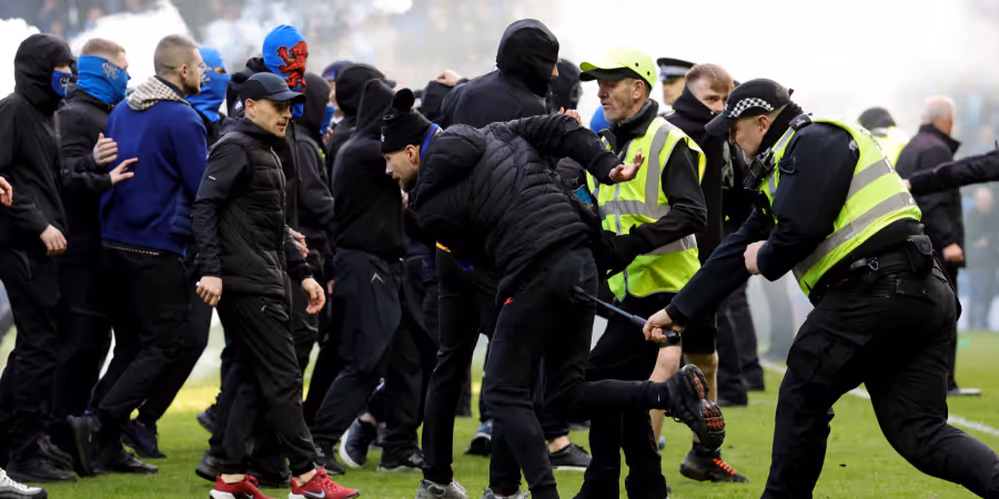 Das traditionsreiche Glasgow-Derby endet im Chaos. Nach dem entscheidenden Penalty stürmen Hunderte Fans auf den Rasen des Ibrox Stadium.