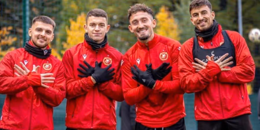 Andi Zeqiri posiert bei seinem Club mit Teamkollegen, macht dabei den Doppeladler. Der Schweizer Nati-Star erntet Kritik aus dem Kosovo.