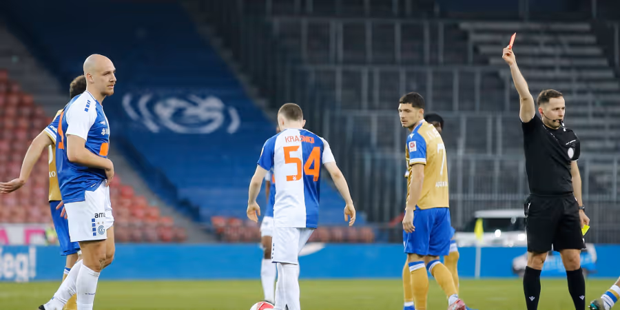 Der 31-jährige Stürmer sieht in der 89. Minute Gelb, weil er in Goalie Hammel reingrätscht. Kurz darauf kommt Frey auch gegen Mouanga zu spät und kassiert die Ampelkarte.