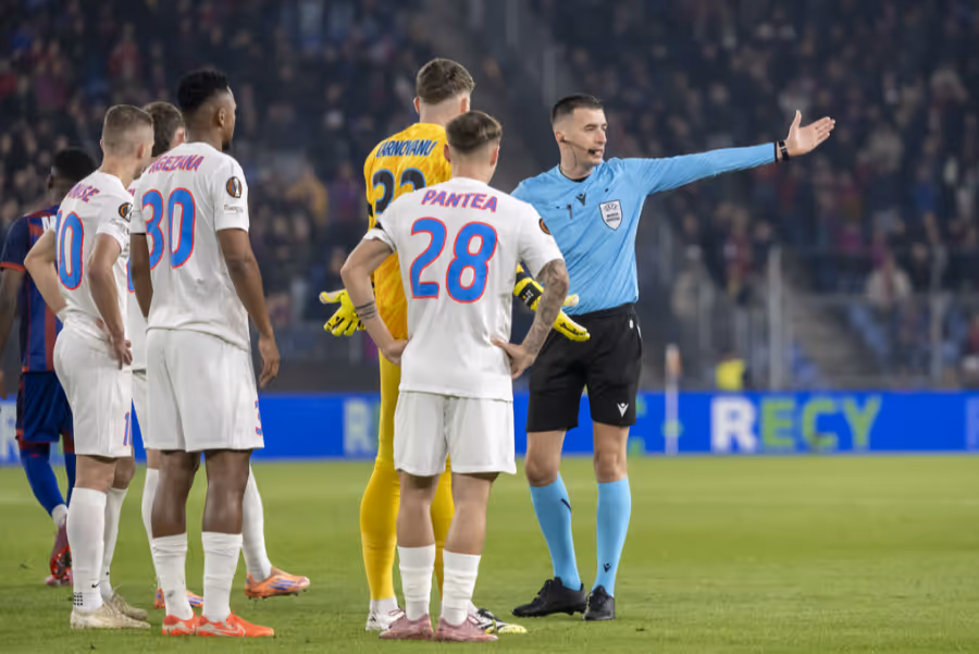 Die Partie ist erst elf Minuten alt, da spielt der FCB schon in Überzahl. Moritz Broschinski läuft auf das Tor des rumänischen Meisters zu und will den Ball an Goalie Stefan Tarnovanu vorbeischiessen. Dieser wehrt ausserhalb des Strafraums mit dem Arm ab und sieht die Rote Karte.