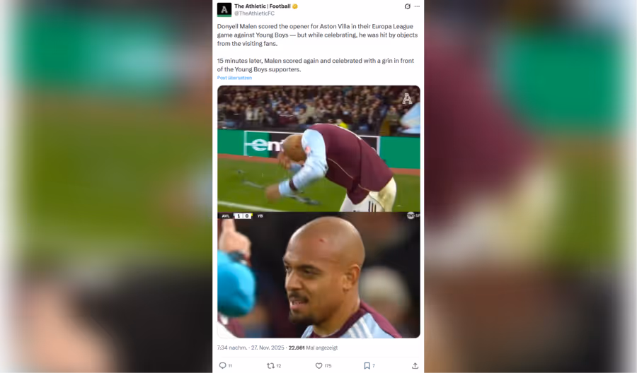 Auch Torschütze Malen kommt nicht unbeschadet davon: Der Villa-Torjäger wird schon beim Jubel nach dem ersten Treffer vermutlich von einem Bierbecher am Kopf getroffen.