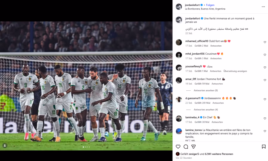 Dabei verteidigt er nicht nur stark, sondern erzielt in der Nachspielzeit das 1:2-Anschlusstor. Ein unvergesslicher Tag für den Innenverteidiger, der mit 32 Jahren erstmals für Mauretanien aufläuft.