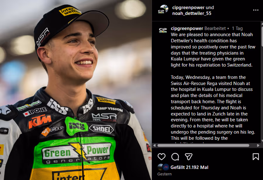 Zwei Wochen nach dem schweren Unfall beim Moto3-Rennen in Malaysia ist Noah Dettwiler (20) zurück in der Schweiz. Sein Manager gibt ein Update.