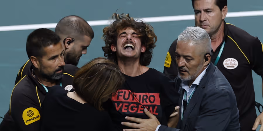 Zwei Personen stürmten in Málaga den Tennisplatz und versuchen, sich am Netz festzubinden. Sie trugen ein T-Shirt mit der Aufschrift «Futuro Vegetal» (deutsch: «vegetarische Zukunft»).