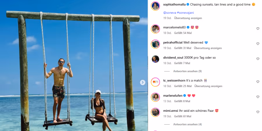 Der 28-jährige Tennisspieler und die acht Jahre ältere Thomalla sind seit 2021 liiert. Zuletzt hat sich das Duo mit Dackel Mishka verstärkt. Dieser fehlt in den Malediven aber – Mishka hat bei Sophias Mama Simone Thomalla Unterschlupf gefunden.
