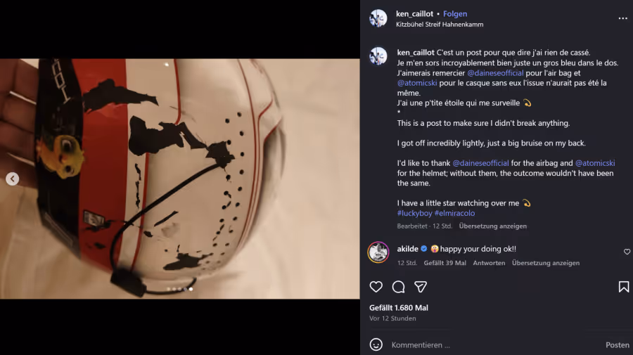 Der Franzose gibt Entwarnung: «Ich habe nichts gebrochen», schreibt Caillot auf Instagram. Er sei «unglaublich glimpflich davongekommen» und habe «nur eine grosse Prellung am Rücken».