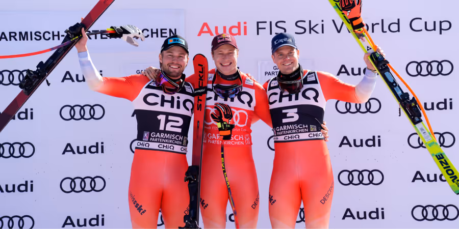 In Garmisch-Partenkirchen gibt es den Dreifachsieg: Marco Odermatt gewinnt vor Alexis Monney und Stefan Rogentin.