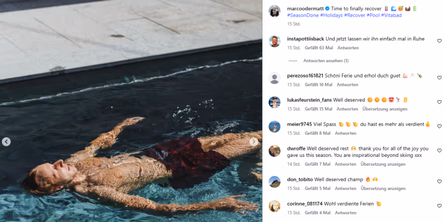 Diese geniesst der Nidwaldner weit weg vom Schnee. Vom Skidress scheint er erstmal genug zu haben – und setzt stattdessen auf die Badehose. Der 28-Jährige veröffentlicht auf Instagram ein Bild, das ihn beim «Köpfler» in einen Pool zeigt.